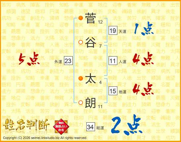 菅(12画)谷(7画) 太(4画)朗(11画)