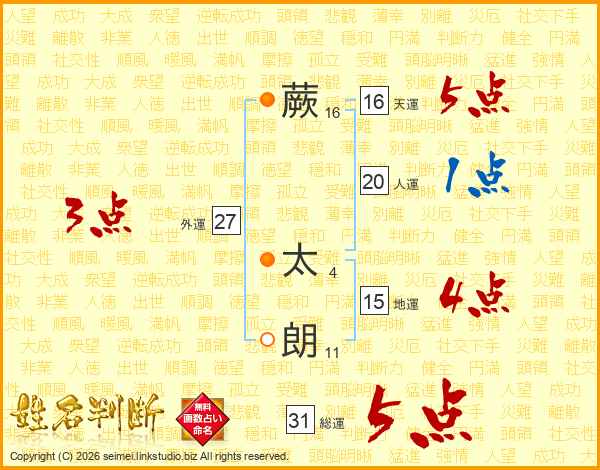 蕨太朗さんの総運は31画の5点!