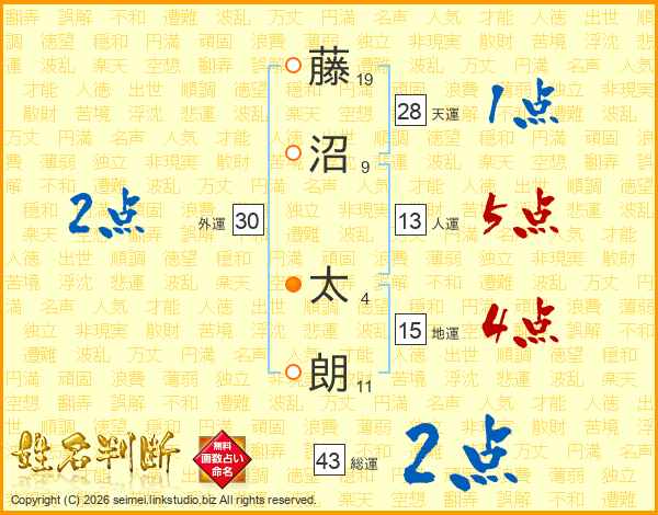 藤(19画)沼(9画) 太(4画)朗(11画)
