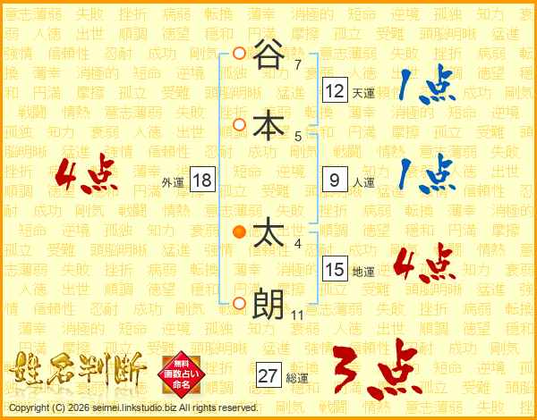 谷(7画)本(5画) 太(4画)朗(11画)