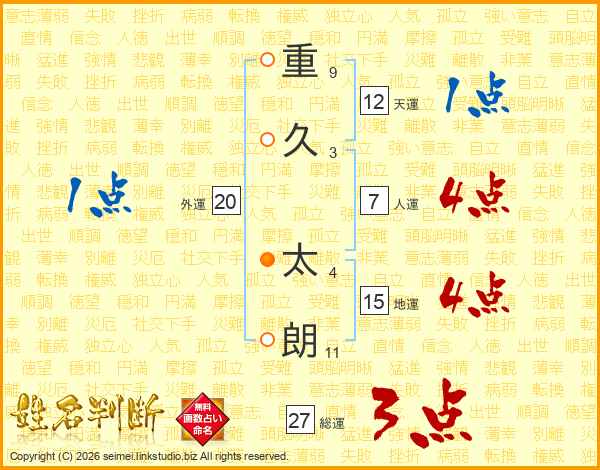 重(9画)久(3画) 太(4画)朗(11画)