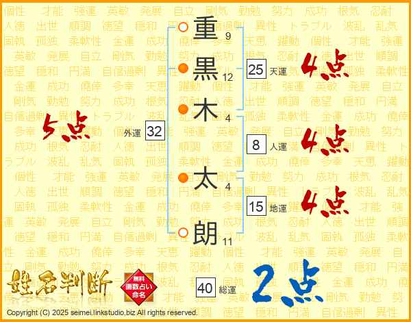重(9画)黒(12画)木(4画) 太(4画)朗(11画)