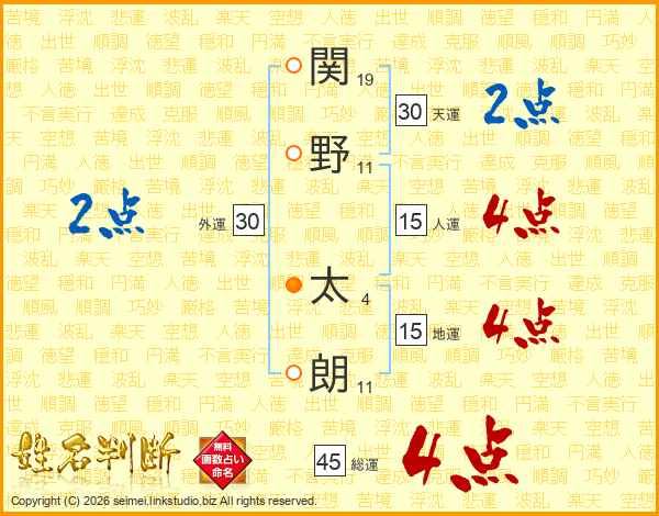あなたの人生を表す1番重要な運勢です。生涯を通じて影響する総合運となり、主に50歳以降の晩年期に影響を及ぼします。苗字と名前の合計画数。