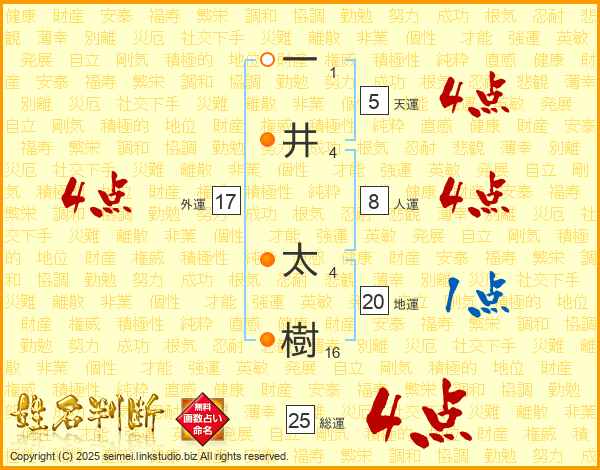 生活面を象徴する運勢です。外部から受ける影響力を表し、結婚運、家庭運や職場、環境への順応性を表します。総運から人運を引いた画数。姓や名が1文字の場合を除く。