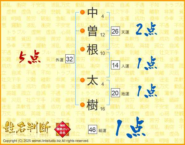 中(4画)曽(12画)根(10画) 太(4画)樹(16画)