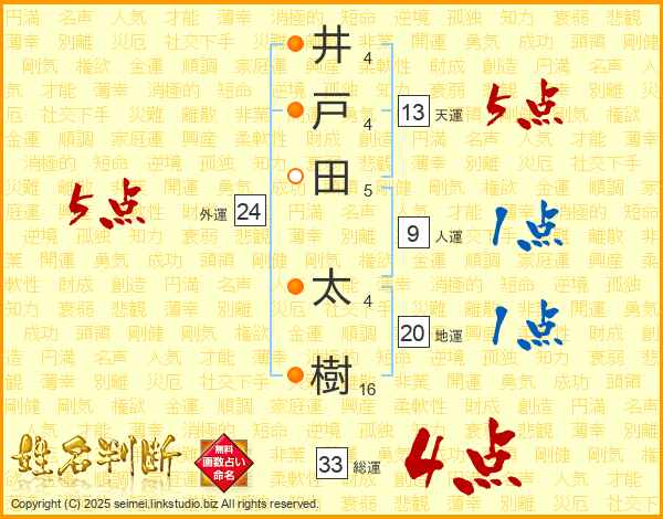 井(4画)戸(4画)田(5画) 太(4画)樹(16画)