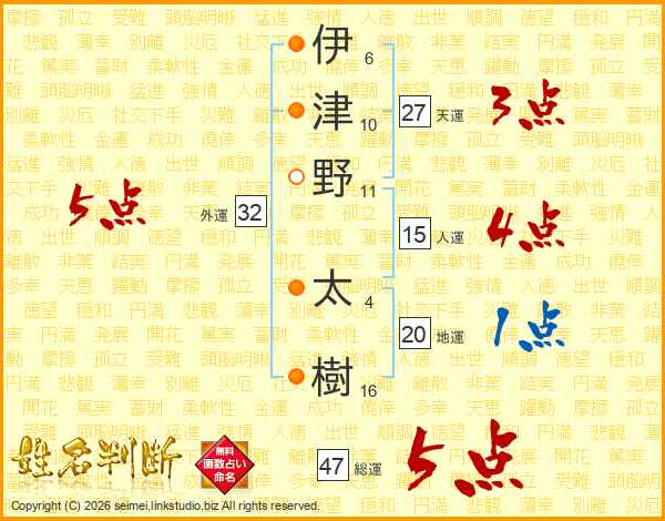 伊(6画)津(10画)野(11画) 太(4画)樹(16画)