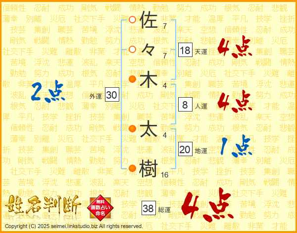 佐々木太樹さんの総運は38画の4点!