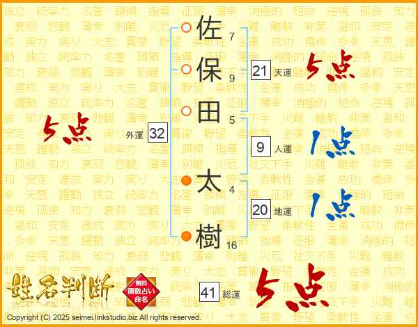 佐(7画)保(9画)田(5画) 太(4画)樹(16画)