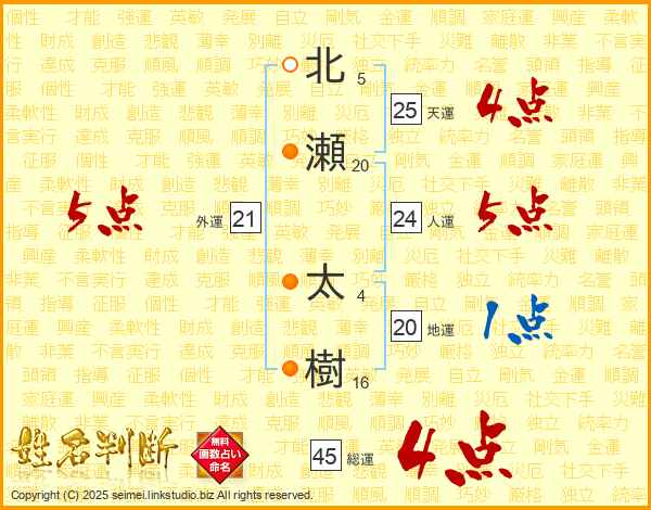 北瀬太樹さんの総運は45画の4点!