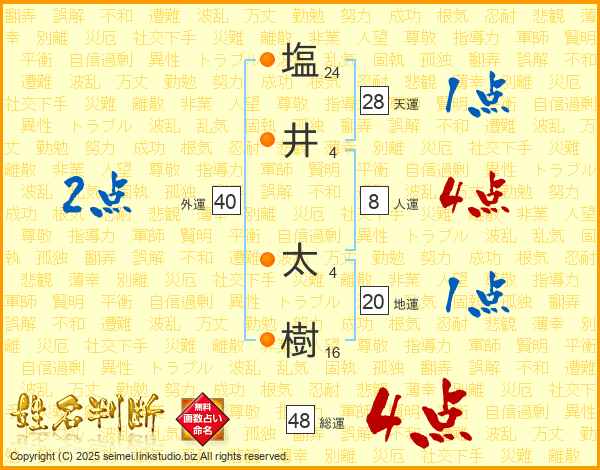 生活面を象徴する運勢です。外部から受ける影響力を表し、結婚運、家庭運や職場、環境への順応性を表します。総運から人運を引いた画数。姓や名が1文字の場合を除く。