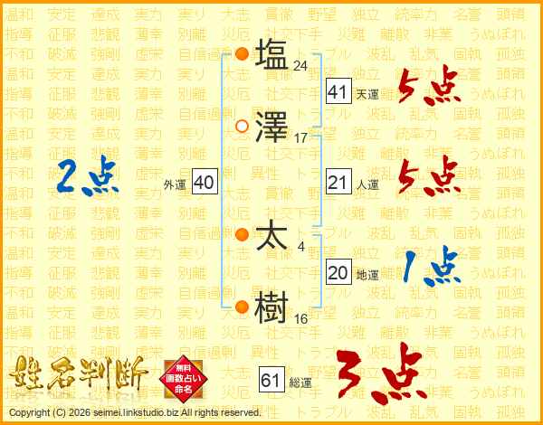 塩(24画)澤(17画) 太(4画)樹(16画)