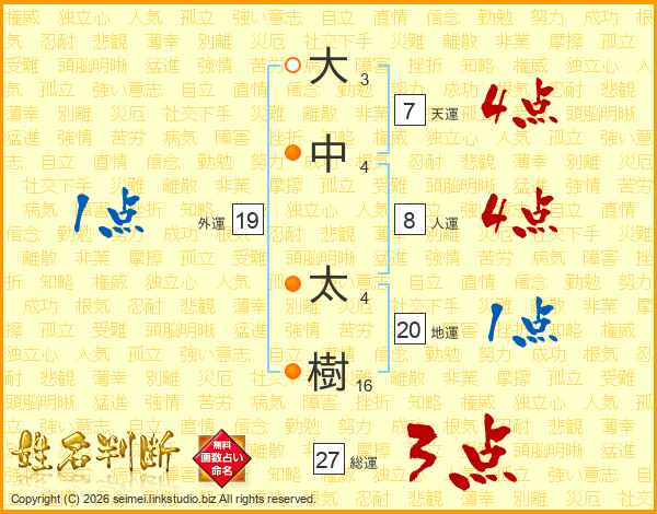 大(3画)中(4画) 太(4画)樹(16画)