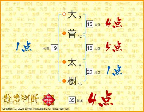 あなたの人生を表す1番重要な運勢です。生涯を通じて影響する総合運となり、主に50歳以降の晩年期に影響を及ぼします。苗字と名前の合計画数。