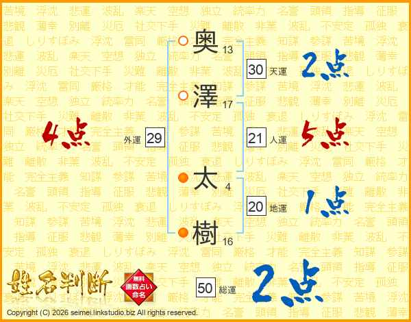 奥(13画)澤(17画) 太(4画)樹(16画)