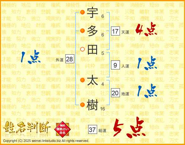 宇多田太樹さんの総運は37画の5点!