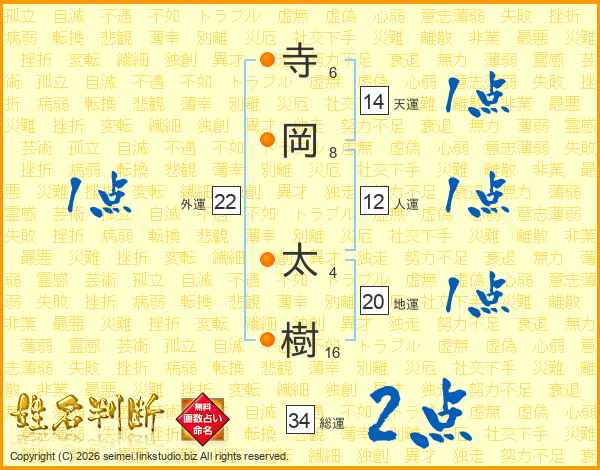 寺(6画)岡(8画) 太(4画)樹(16画)