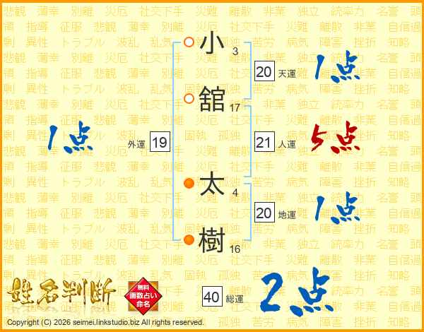 生活面を象徴する運勢です。外部から受ける影響力を表し、結婚運、家庭運や職場、環境への順応性を表します。総運から人運を引いた画数。姓や名が1文字の場合を除く。