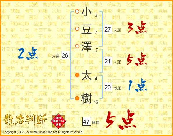 小(3画)豆(7画)澤(17画) 太(4画)樹(16画)