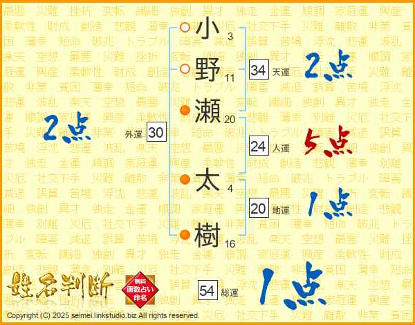 小(3画)野(11画)瀬(20画) 太(4画)樹(16画)