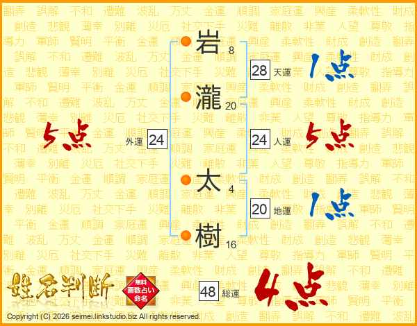 岩(8画)瀧(20画) 太(4画)樹(16画)