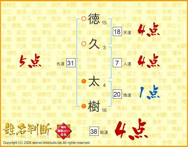 徳(15画)久(3画) 太(4画)樹(16画)