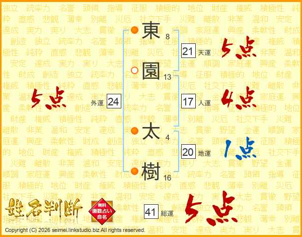 あなたの人生を表す1番重要な運勢です。生涯を通じて影響する総合運となり、主に50歳以降の晩年期に影響を及ぼします。苗字と名前の合計画数。