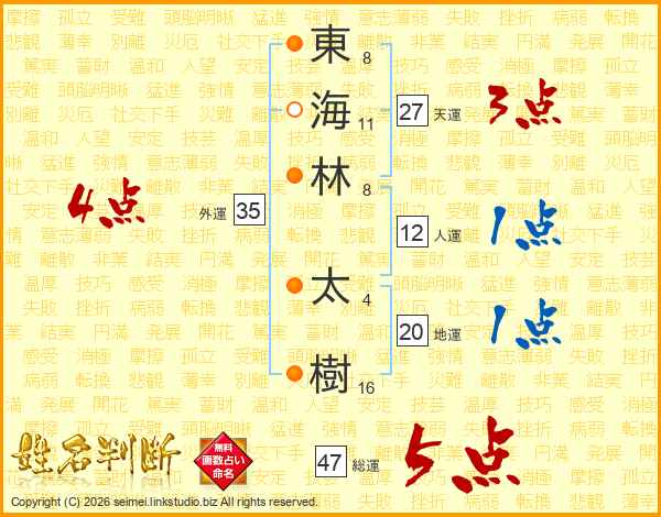 東(8画)海(11画)林(8画) 太(4画)樹(16画)