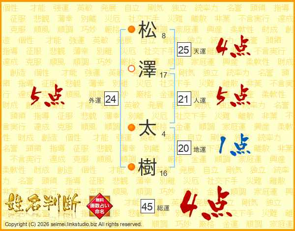 あなたの人生を表す1番重要な運勢です。生涯を通じて影響する総合運となり、主に50歳以降の晩年期に影響を及ぼします。苗字と名前の合計画数。
