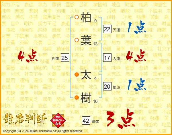 柏(9画)葉(13画) 太(4画)樹(16画)