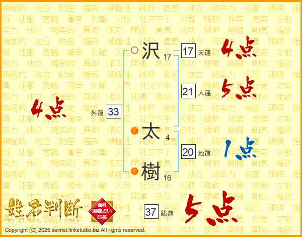 沢(17画) 太(4画)樹(16画)