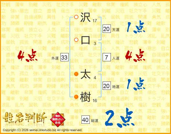 生活面を象徴する運勢です。外部から受ける影響力を表し、結婚運、家庭運や職場、環境への順応性を表します。総運から人運を引いた画数。姓や名が1文字の場合を除く。