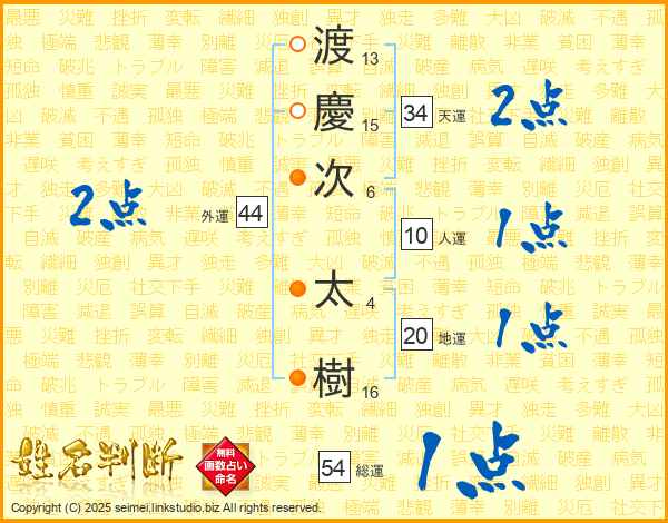 渡(13画)慶(15画)次(6画) 太(4画)樹(16画)
