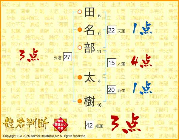 田(5画)名(6画)部(11画) 太(4画)樹(16画)