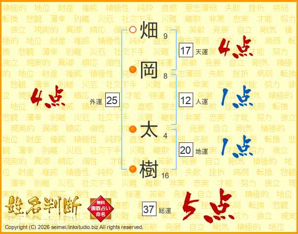 畑(9画)岡(8画) 太(4画)樹(16画)