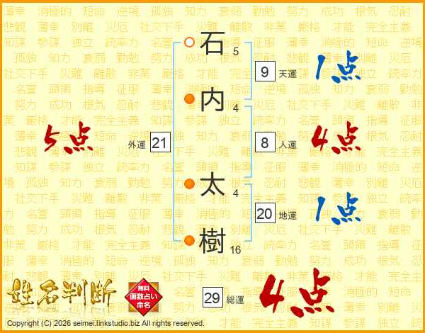 あなたの人生を表す1番重要な運勢です。生涯を通じて影響する総合運となり、主に50歳以降の晩年期に影響を及ぼします。苗字と名前の合計画数。