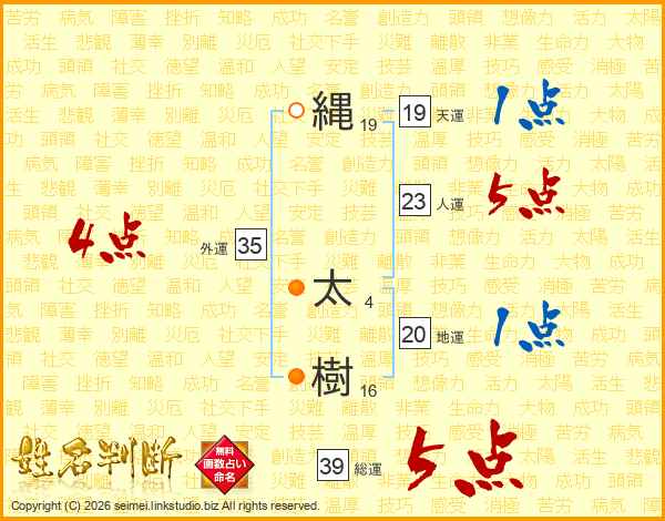 縄太樹さんの総運は39画の5点!