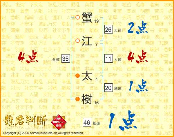 蟹(19画)江(7画) 太(4画)樹(16画)