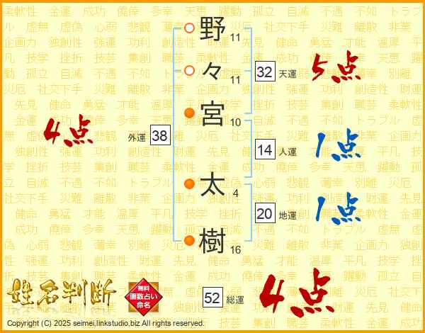 野(11画)々(11画)宮(10画) 太(4画)樹(16画)