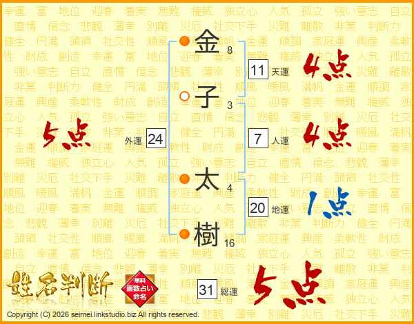 金子太樹さんの総運は31画の5点!