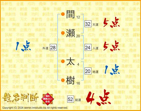 間瀬太樹さんの総運は52画の4点!