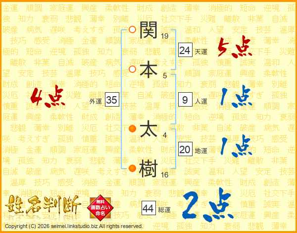関(19画)本(5画) 太(4画)樹(16画)