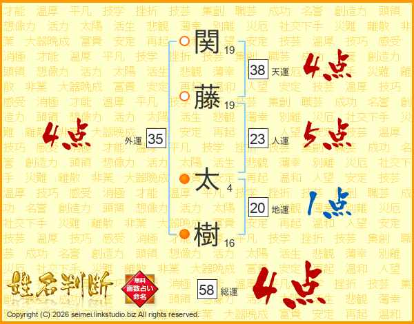 関藤太樹さんの総運は58画の4点!