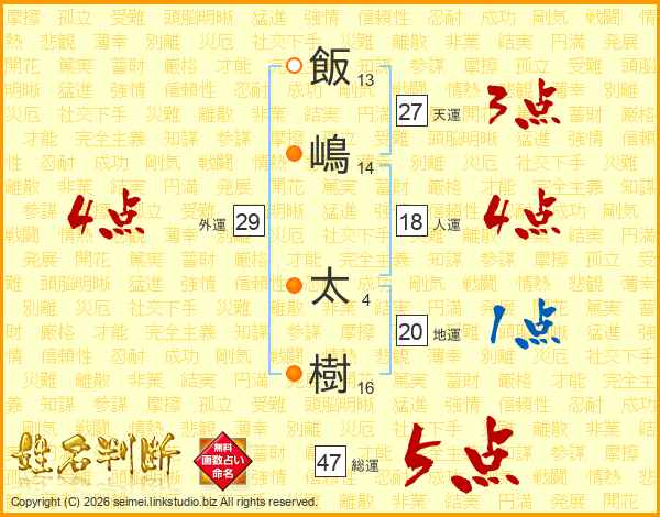 飯嶋太樹さんの総運は47画の5点!