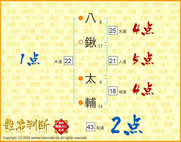 八鍬太輔さんの総運は43画の2点!