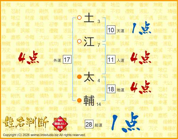 生活面を象徴する運勢です。外部から受ける影響力を表し、結婚運、家庭運や職場、環境への順応性を表します。総運から人運を引いた画数。姓や名が1文字の場合を除く。