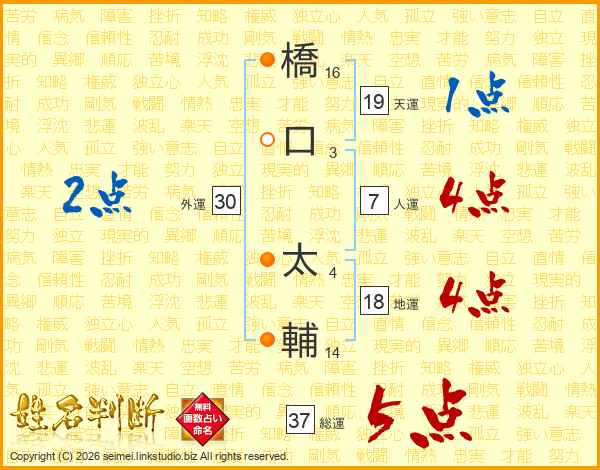 あなたの人生を表す1番重要な運勢です。生涯を通じて影響する総合運となり、主に50歳以降の晩年期に影響を及ぼします。苗字と名前の合計画数。