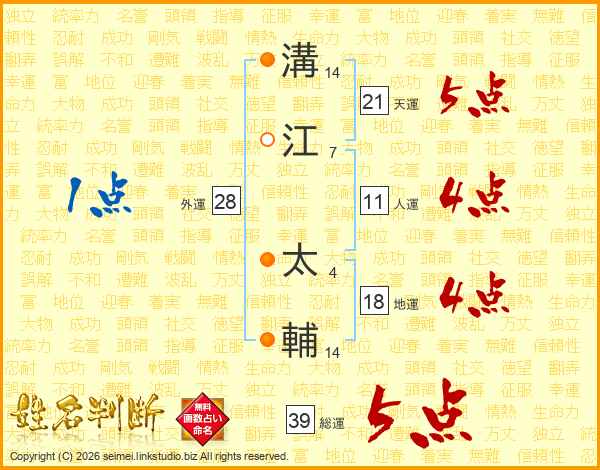 生活面を象徴する運勢です。外部から受ける影響力を表し、結婚運、家庭運や職場、環境への順応性を表します。総運から人運を引いた画数。姓や名が1文字の場合を除く。
