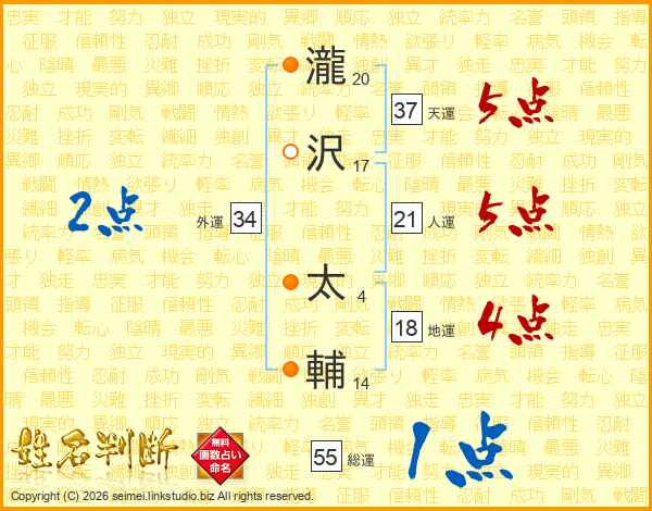 瀧(20画)沢(17画) 太(4画)輔(14画)