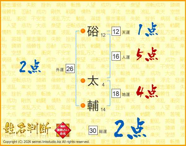 あなたの人生を表す1番重要な運勢です。生涯を通じて影響する総合運となり、主に50歳以降の晩年期に影響を及ぼします。苗字と名前の合計画数。